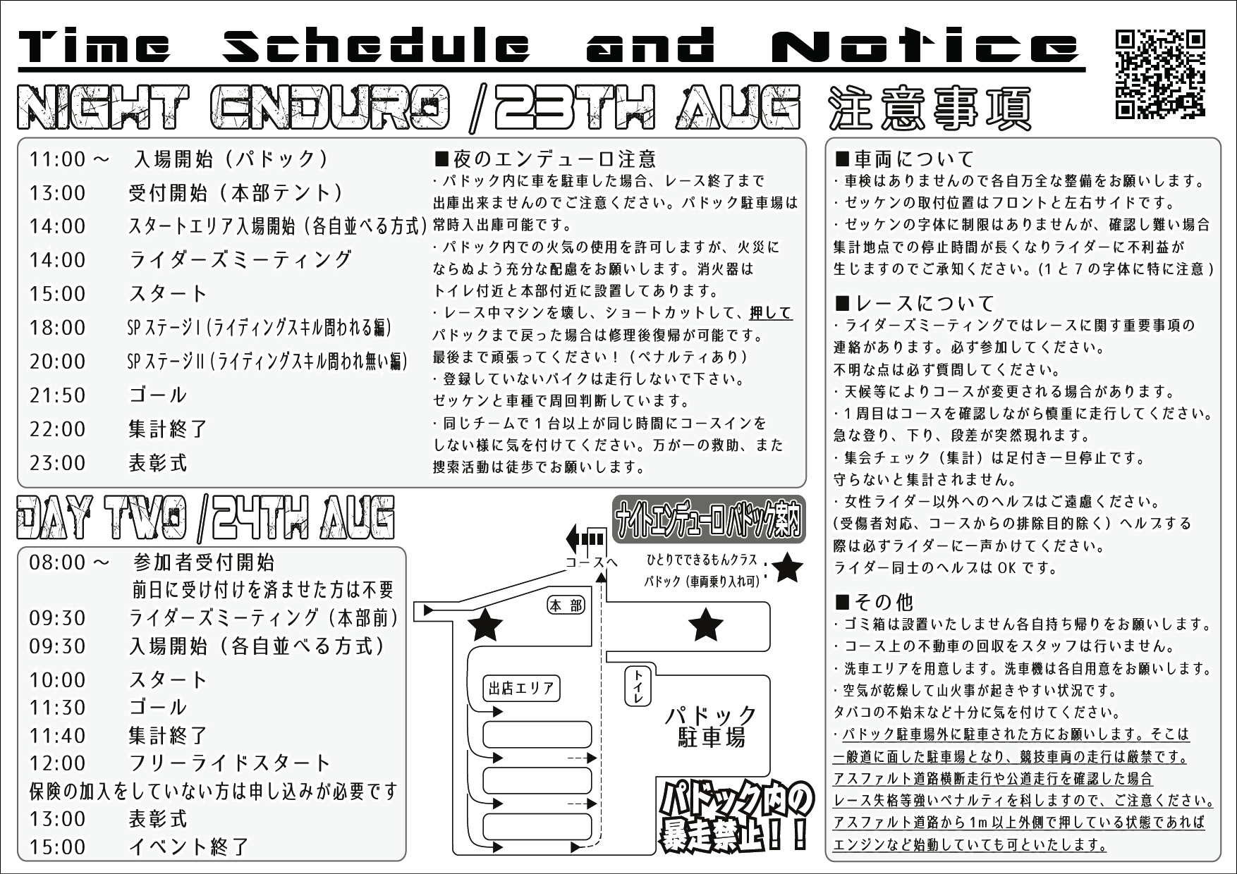 | 車両規定 | 十分に消音されたサイレンサーを装着していること エンジンを停止しても点灯しているテールランプを装備していること ゼッケンを車体前部と左右合計3か所に貼付する事(書体、色は任意) |